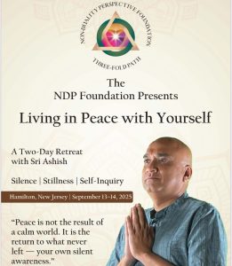 Rooted in the living presence and vision of Sri Ashish, NDP Foundation is a sanctuary for sincere seekers who long to return to what has always been — the undivided awareness that rests behind all experience. Through the Three-Fold Path of Right Understanding, Right Practice, and Right Experience, we offer a gentle yet radical unraveling of illusion — not by effort, but through deep seeing.